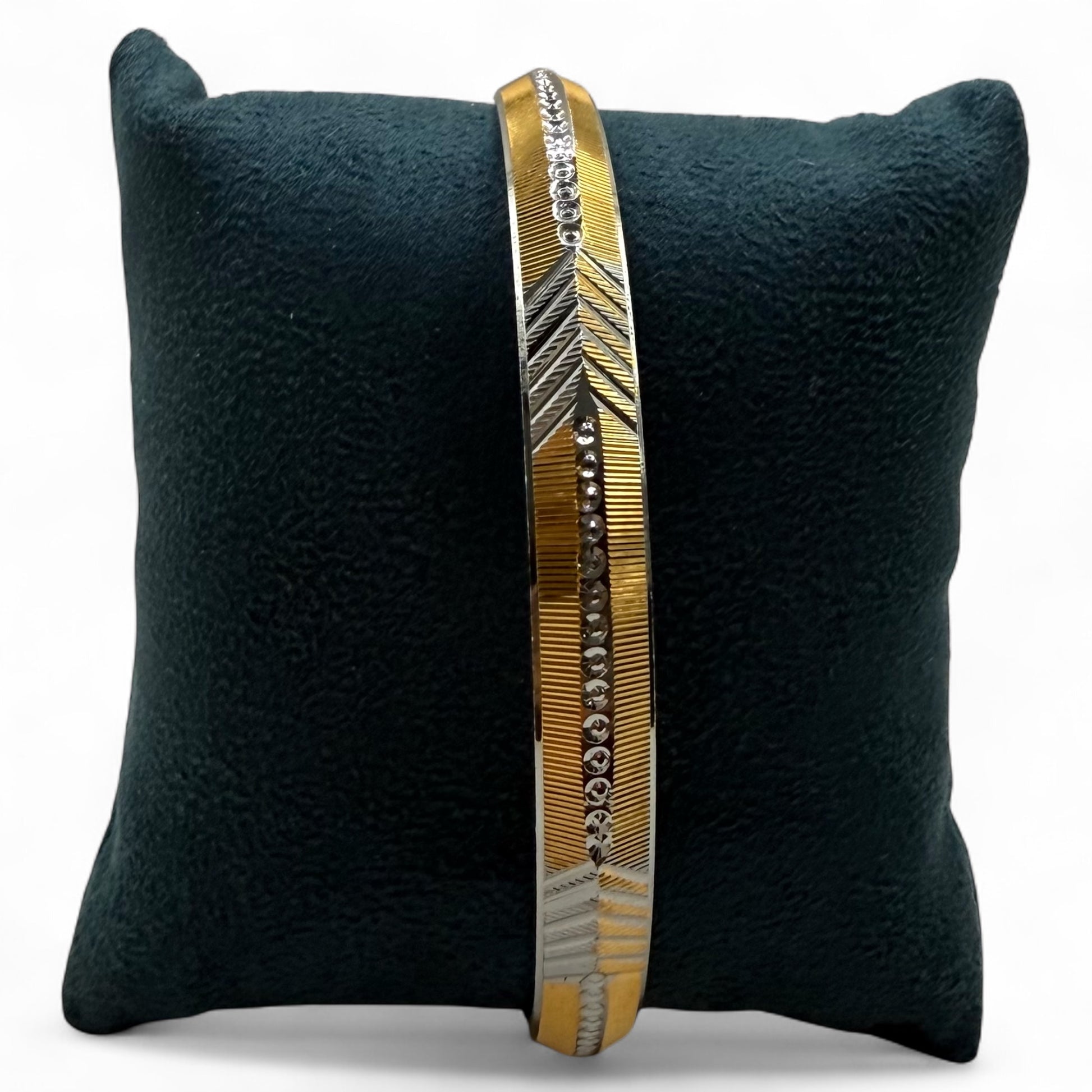 A bold sterling silver kada with arrow-inspired detailing in a dual golden-silver finish.